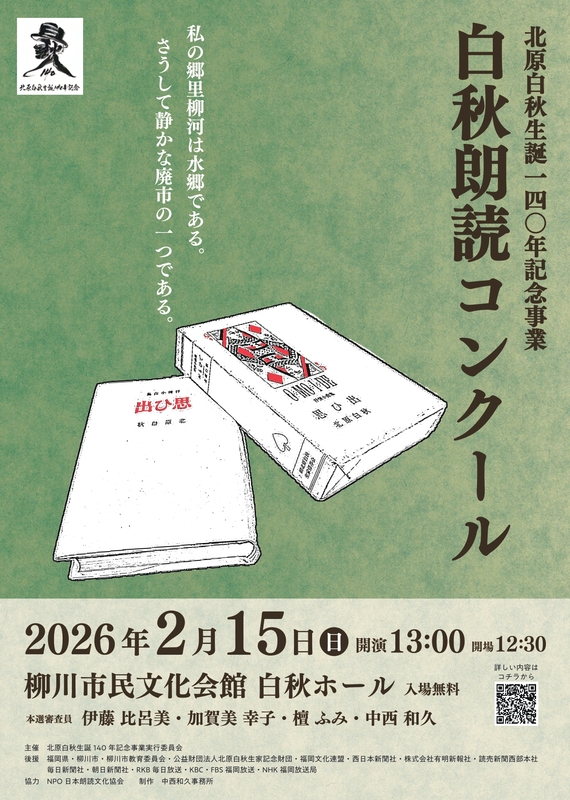 北原白秋生誕140年記念事業として、2026年2月15日に白秋朗読コンクール本選を開催します。 全国より応募された167名の中から20名の本選出場者が朗読を披露します。 国民的詩人北原白秋の抒情小曲集【思ひ出】より朗読の課題を選定し、...